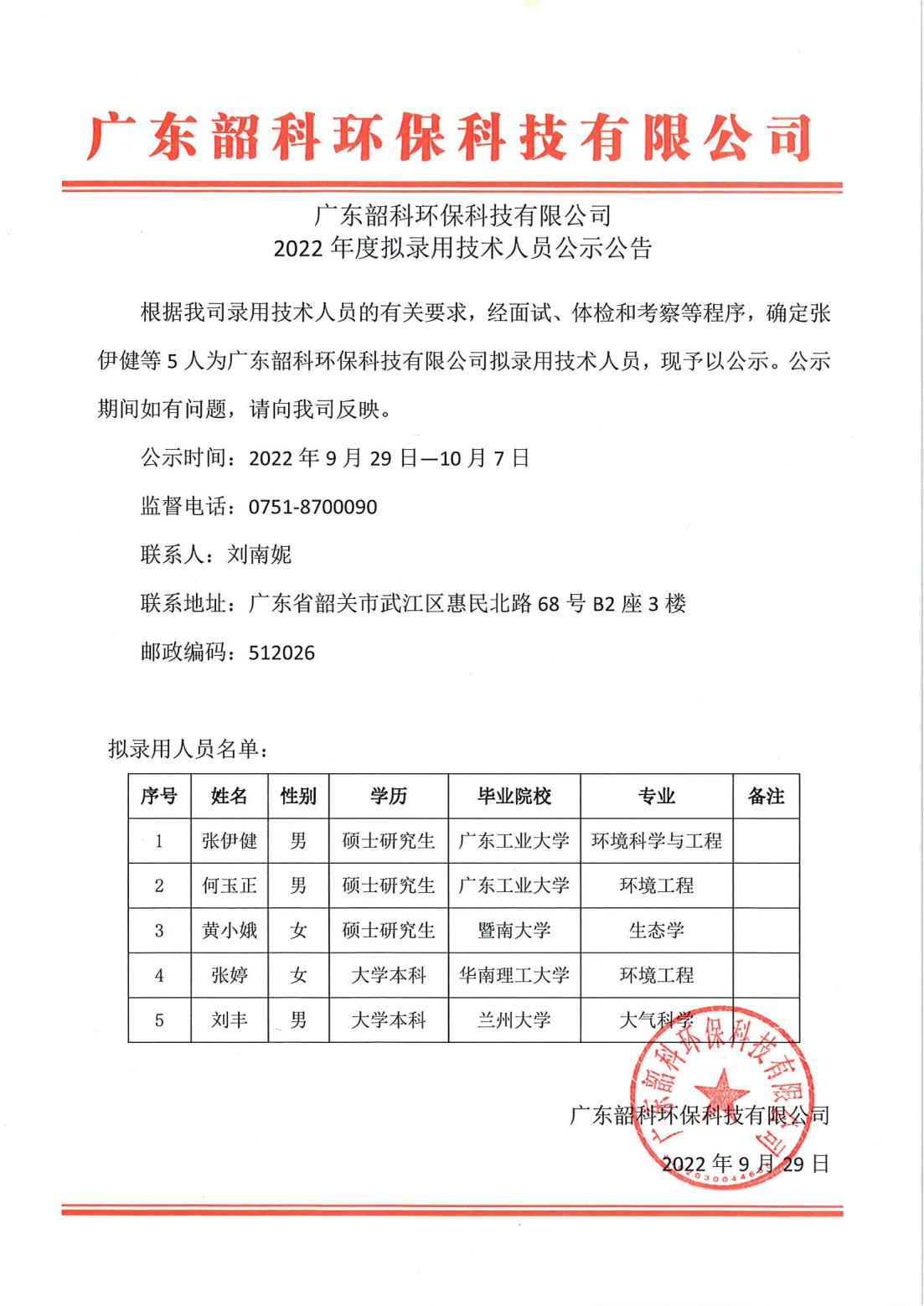 根據(jù)我司錄用技術(shù)人員的有關(guān)要求,經(jīng)面試、體檢和考察等程序,確定張伊健等5人為廣東韶科環(huán)保科技有限公司擬錄用技術(shù)人員,現(xiàn)予以公示。公示期間如有問題,請向我司反映。